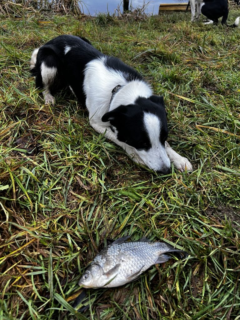 Et pourtant… en baissant les yeux, la surprise était totale. Une petite carpe venait d’être déposée juste devant moi. Argos est arrivée tout penaude, presque discrète, comme si elle venait de faire une bêtise… avant de nous regarder, l’air fier malgré tout, comme pour dire : « Regardez ce que j’ai fait ! ».
